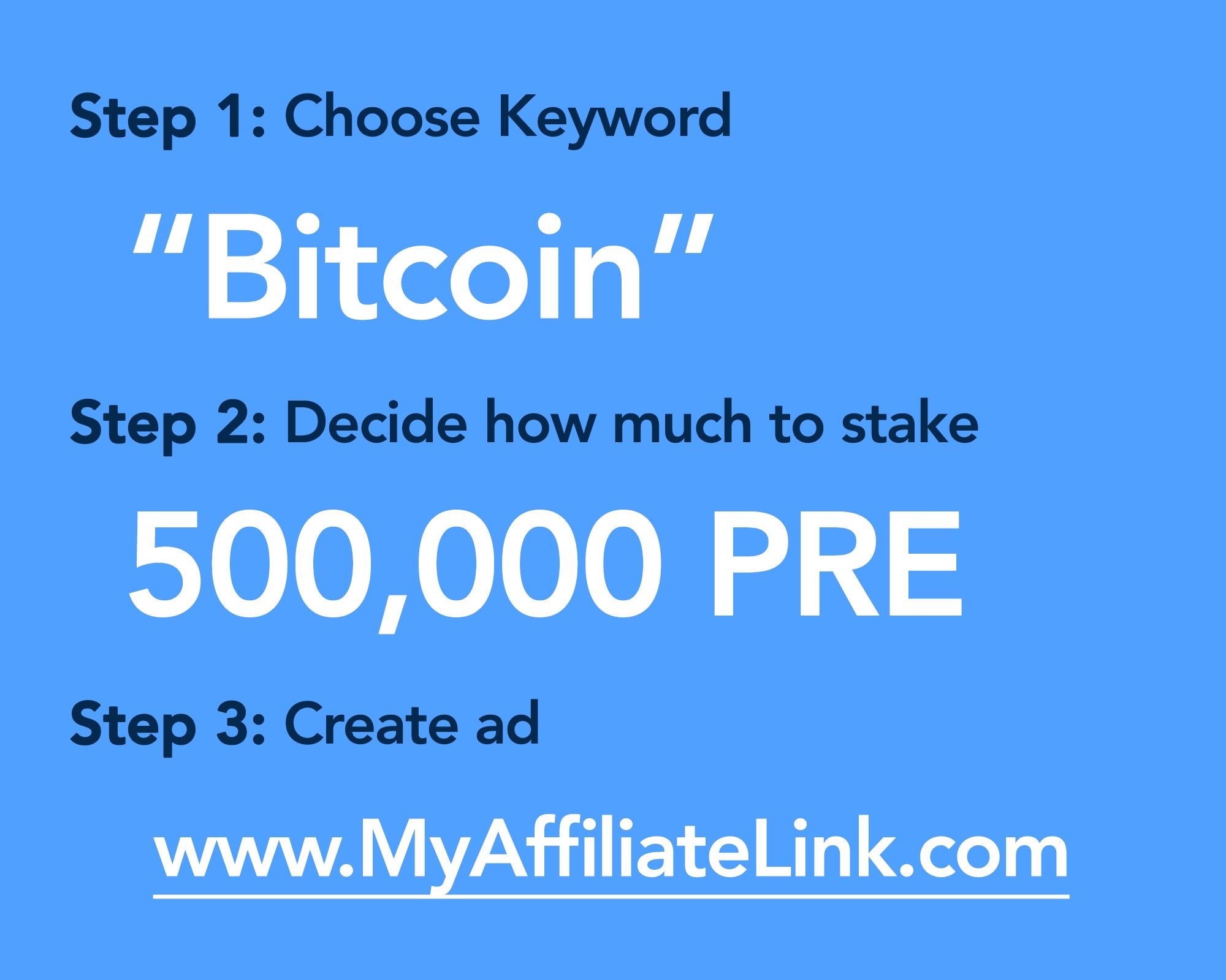 With Presearch Keyword Staking you choose a keyword (ex. ‘Bitcoin’) and then stake PRE tokens that you’ve purchased or earned against that term. You can then create an ad that you link to the website of your choice.