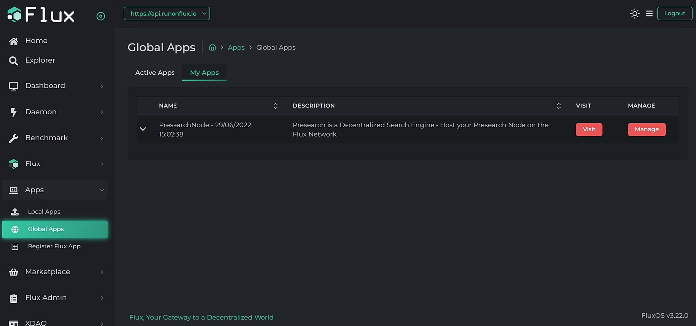 Running a node on FluxOSPresearch nodes are identified by a public/private keypair that is generated the first time the node starts. The FLUX doesn't currently support persistent storage of these keys, however, which means every time a new FLUX instance launches, it connects to the Presearch network as a NEW node, and not the original node. This can cause some problems, for example, if a previous FLUX instance was running with a PRE stake of 2,000 PRE, but the minimum stake for new nodes has increased to 4,000 for all new nodes.