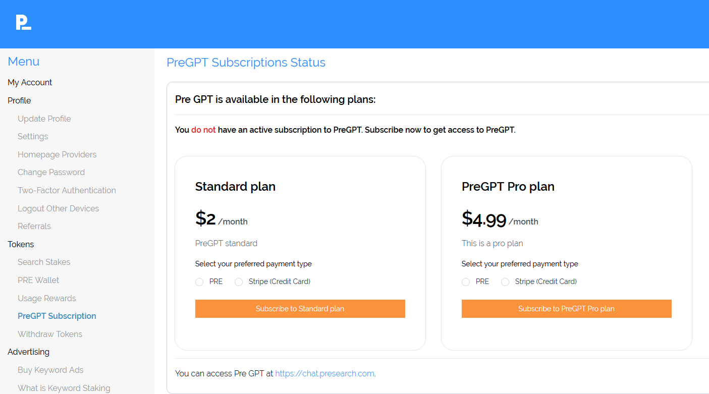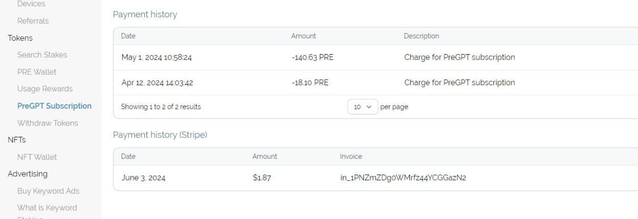 Currently, PreGPT subscriptions can be purchased with PRE tokens and credit cards through the Stripe platform. We plan to accept other cryptocurrencies soon.