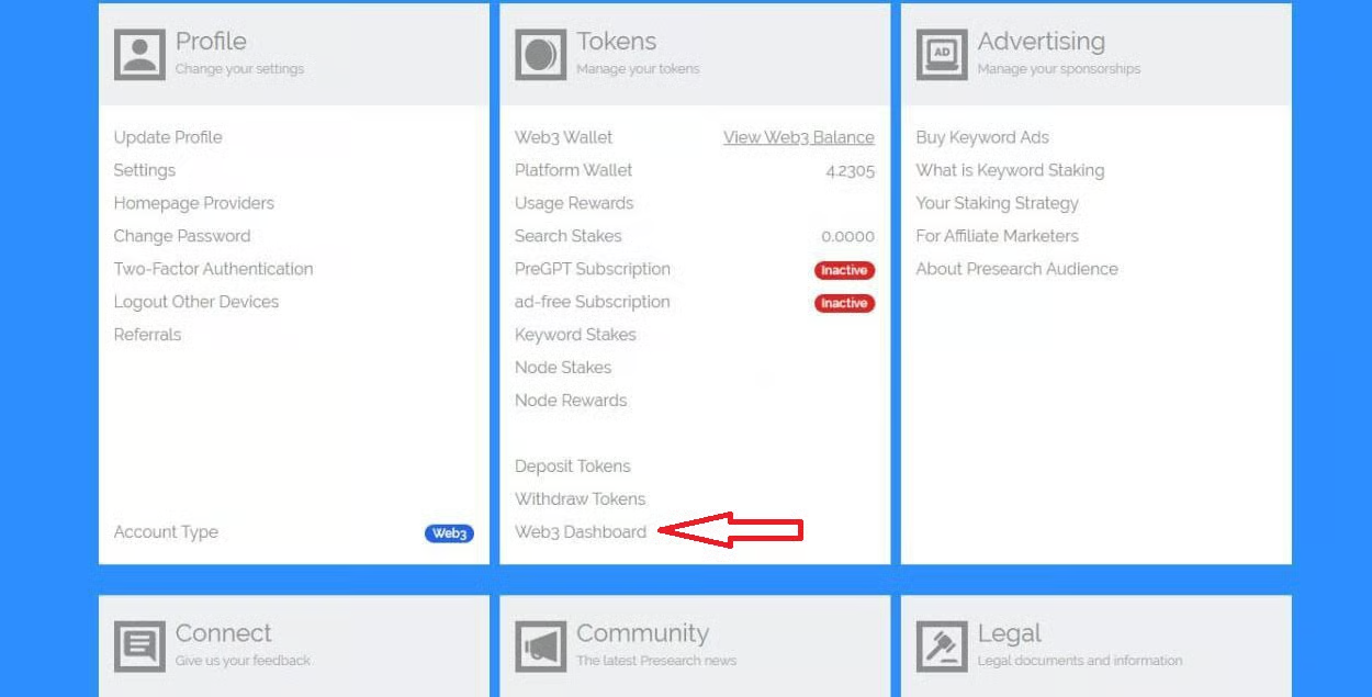 2. Enter your account menu: [My Account](https://account.presearch.com/) and click on Web3 dashboard.