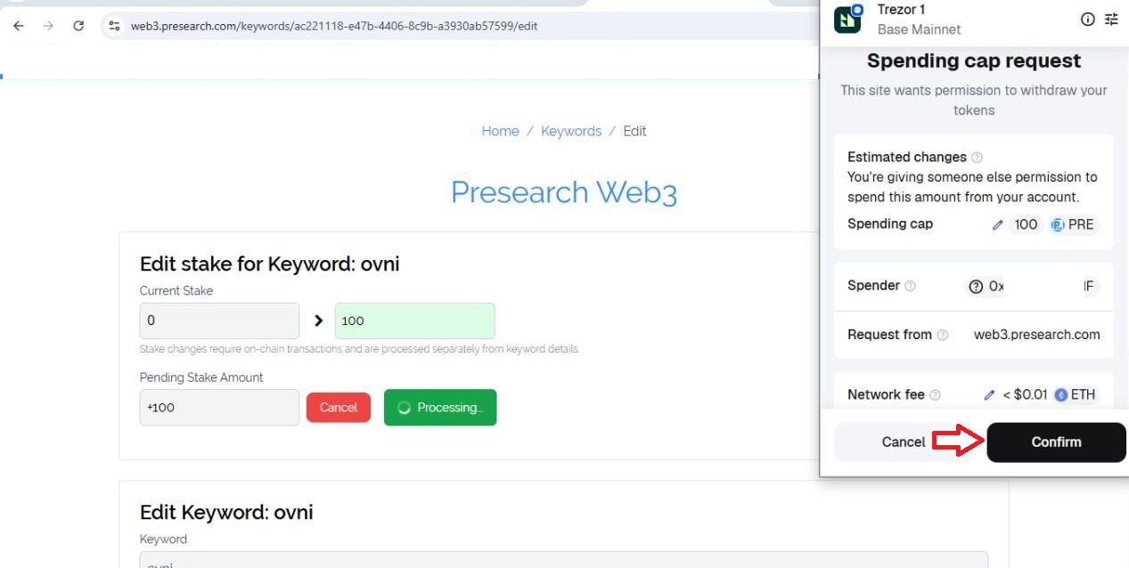 7. Enter the amount of Pre staked and click Update Stake, It is worth mentioning that the minimum stake amount is 100 PRE per keyword.