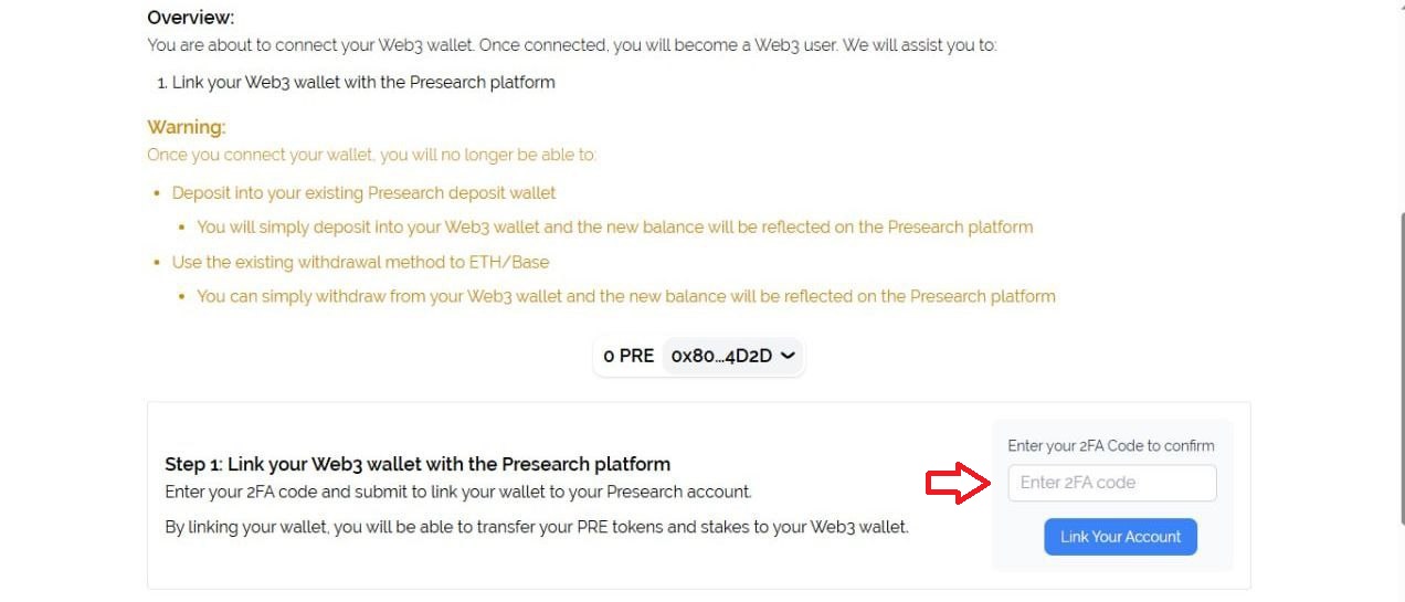 8. Scroll down to step one, enter your two-factor authentication code to link your wallet to your Presearch account.