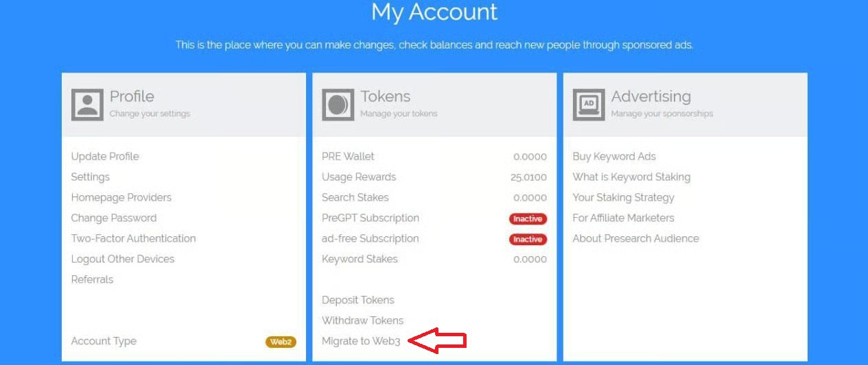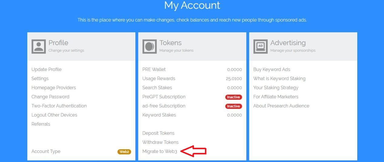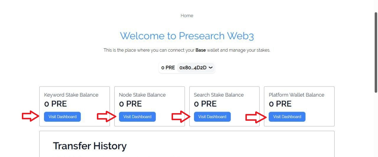 &#x20;Then transfer each of the Stake (Keywords, Nodes, Search) which you must place your 2Fa code and sign the transaction in your wallet., now all your Pre balance is now migrated to Web3 and you will be able to see it on your [dashboard](https://web3.presearch.com/).