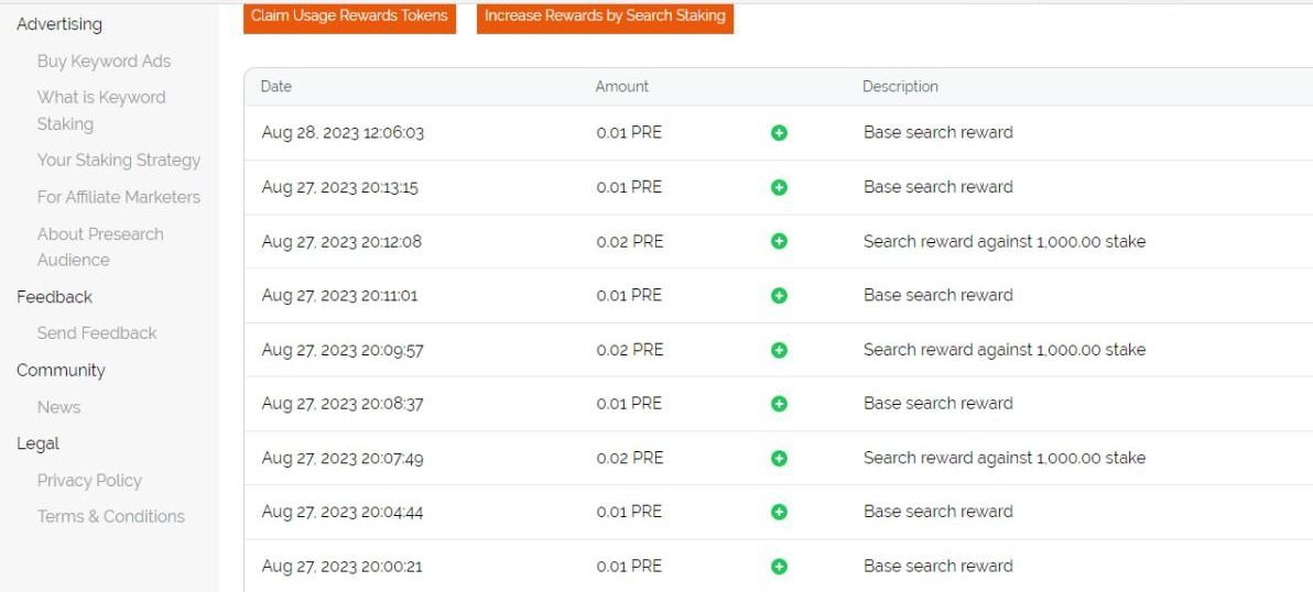 Each user can earn PRE rewards by using the search engine, by default all users receive 0.01 PRE per search, up to 25 searches per day, you can also see it in the following panel Search Reward